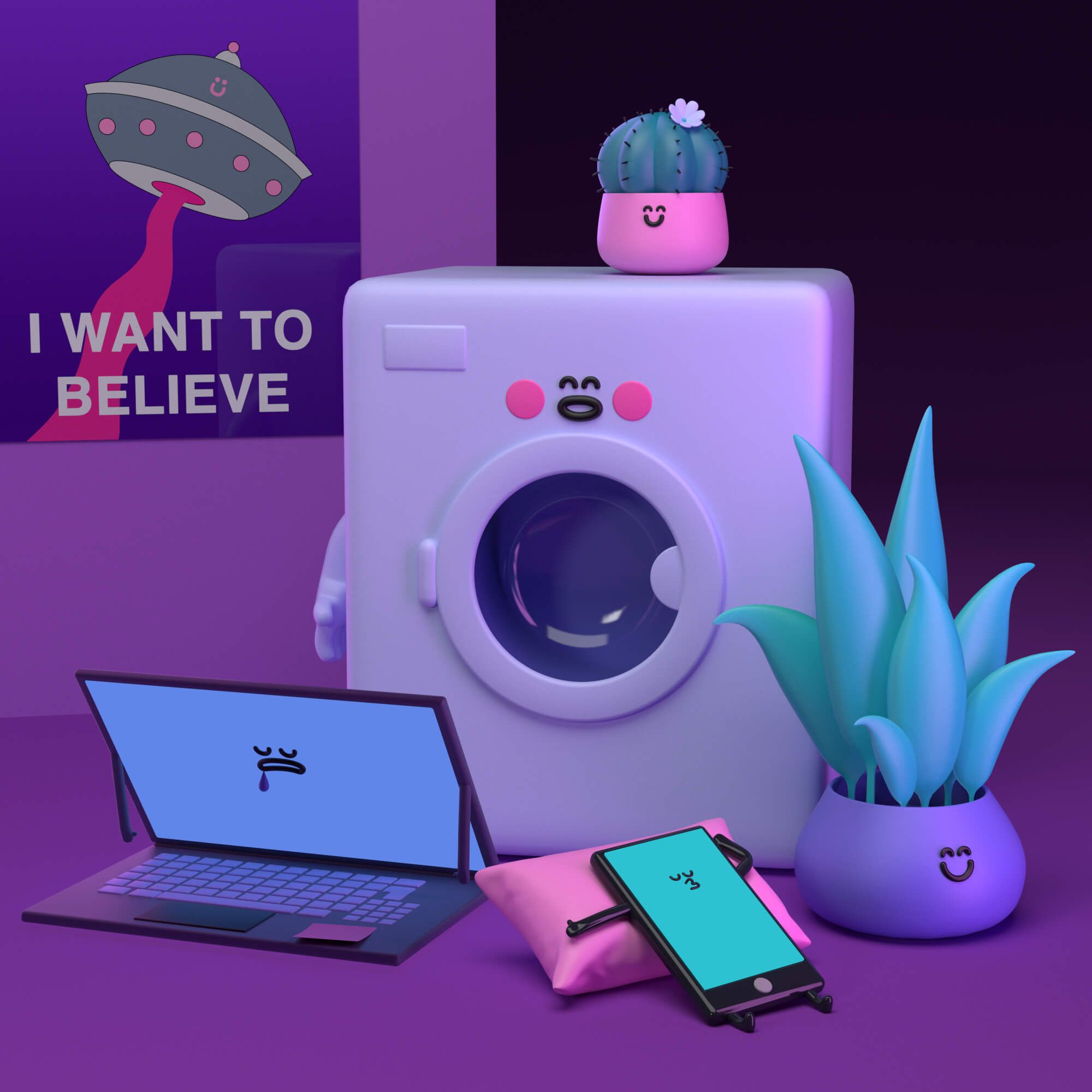 I was in the winter locking down and re-watching the x-files. So, involving an alien abduction of the classic kind seemed to be logical. However, all of the characters needed to be in the same spot to be in the same spot to close the animation loop to ensure that none be actually abducted. This is when I had the idea to have the washing machine open as well as the single pink sock fly up to the UFO.